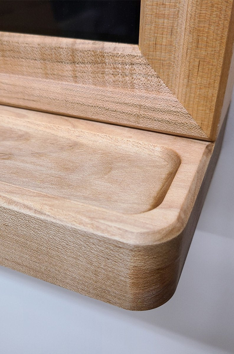 An optional RFID Lock Bar (select below), will keep your Screen locked to the wall and includes a valet tray for your keys, wallet, phone, etc… See this video for operation – basically, the safe opens by swiping an enclosed RFID credit card key at the bottom left corner of the frame. You can also order available key fobs from our supplier.