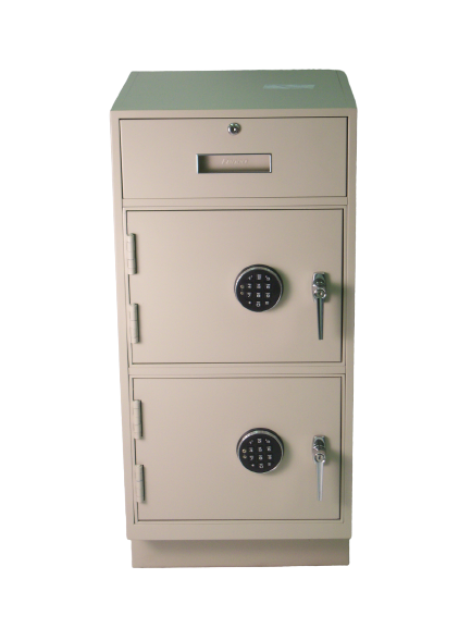 Cash handling is important to any business, especially financial institutions with cash. The Fenco F-206 Pedestal Unit with 1 Locking Box Drawer and 2 Steel Plate Lockers is 38.50" tall and 18.00" wide. Each locker has 1/4" steel behind a 1/2" steel plate doors (B-Rate Burglar Rating), equipped with three-point locking bolt-work, Group 2 Spyproof Mechanical Combination Locks, and Key Locking L-Shaped Handles. Fenco's Goldine 200 Series offers versatility for your teller line, teller pod, back counter, or work room. The top drawer is locked by a key lock.
