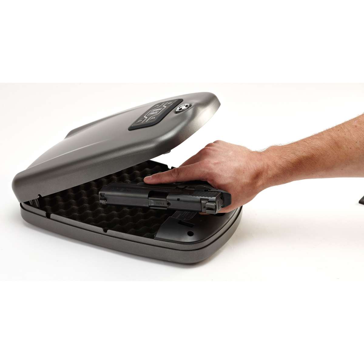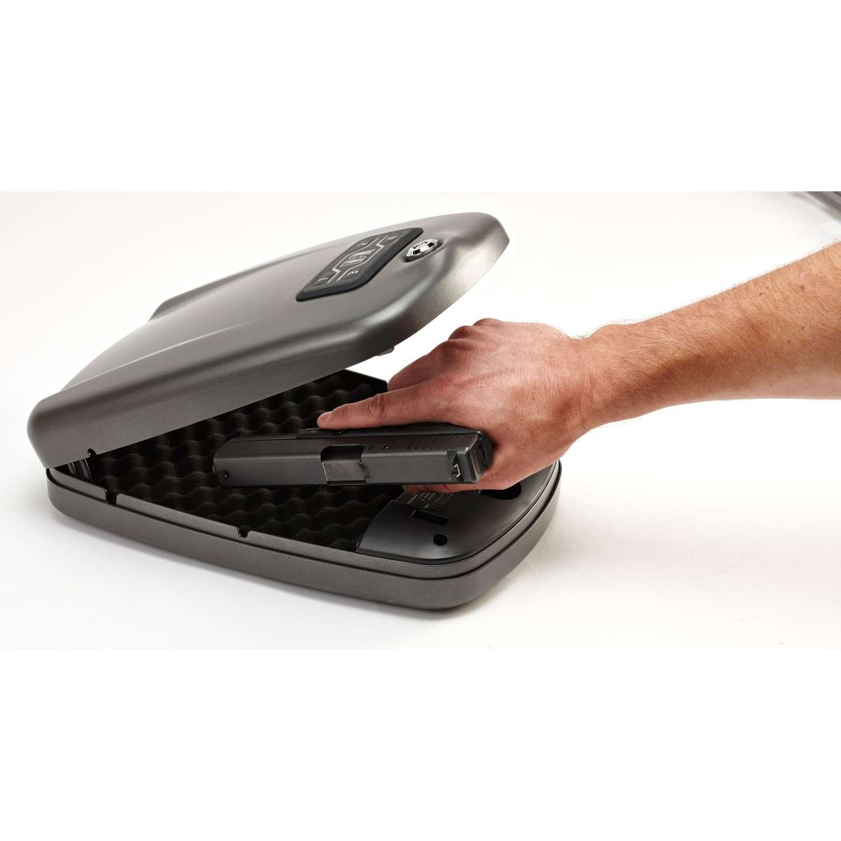 Having quick access to your handgun, especially in an emergency is important. Consider the Hornady Rapid Safe 2700KP XL RFID 98172. It has several ways to get inside quickly. One is using the RFID watchband, key fob, or sticker. Just touch one of those items to the safe and it will instantly open with the spring-assist lid. Up to five RFID tags can be programmed.